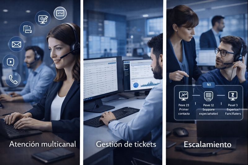 Atención inicial, clasificación, resolución de incidentes comunes y escalamiento cuando corresponda.